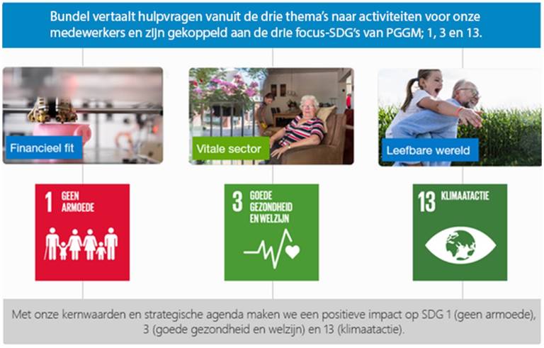 Hiermee richten we ons voornamelijk op lokaal niveau (regio Zeist-Utrecht) op de drie focus SDG’s van PGGM met een drietal thema’s; financiële fitheid, een vitale zorg en welzijn sector en een leefbare wereld.